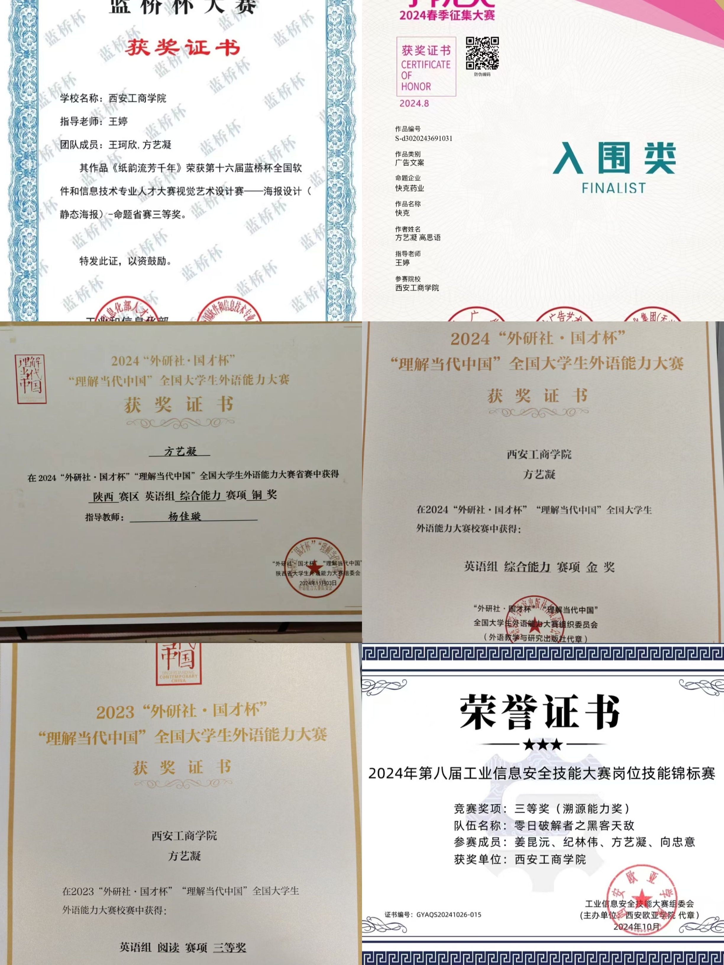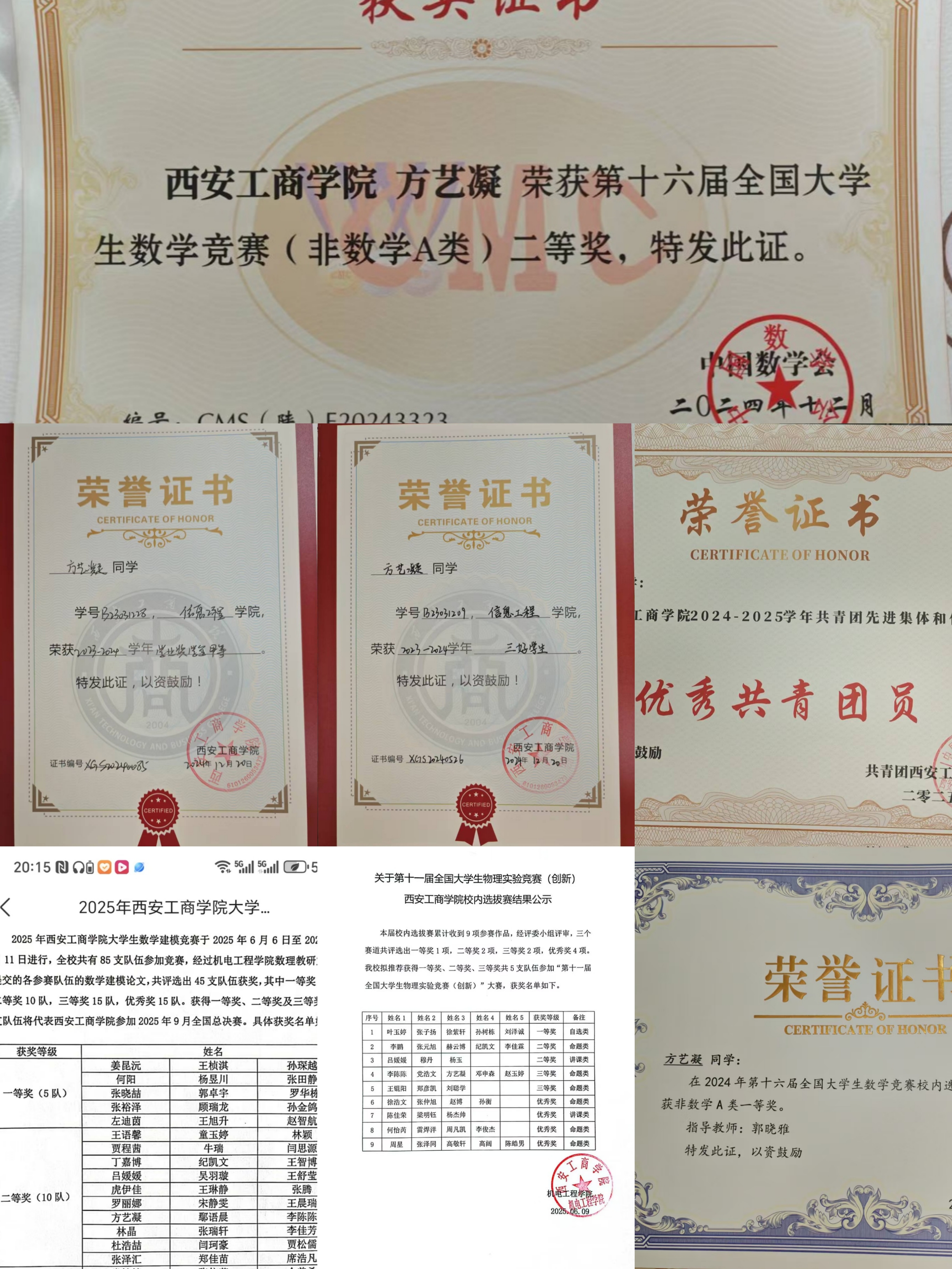 曾获得2024-2025学年国家奖学金、学业奖学金甲等、第十六届全国大学生数学竞赛陕西赛区二等奖奖、外研社•国才杯英语竞赛省级铜奖、第八届信息安全技能大赛国家三等奖、蓝桥杯视觉艺术设计大赛省级三等奖、大广赛学院奖入围奖、2023-2024学年三好学生、物理实验竞赛三等奖、数学建模大赛校赛二等奖、高等数学竞赛校赛一等奖、外研社•国才杯英语竞赛校赛金奖、优秀共青团员等。
